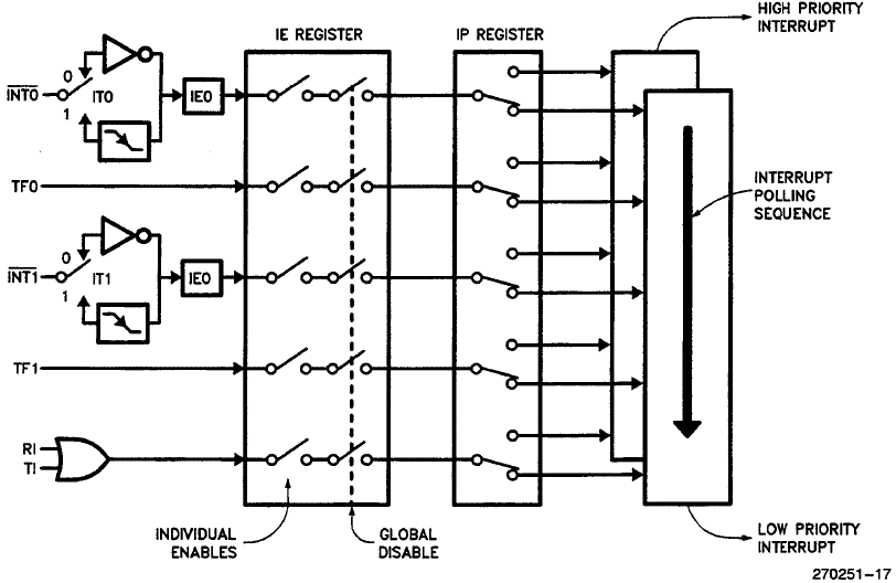 A Figura 6 mostra o sistema de interrupção. Nessa figura é possível observar a função dos registradores Interrupt Enable (IE) e Interrupt Priority (IP). Mas o que acontece quando interrupções simultâneas são capturadas? Bom, nesse caso é necessário avaliar a prioridade da interrupção, e no caso de interrupções com a mesma prioridade a seguinte ordem de avaliação é estabelecida: primeiro IE0, em seguida TF0, IE1, TF1, RI e por ultimo, TI.