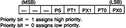 O registrador IP, ilustrado na Figura abaixo, também pode ser endereçado bit a bit e está localizado no endereço B8H. Esse registrador tem como função determinar a prioridade de uma fonte de interrupção, podendo ser alta ou baixa.