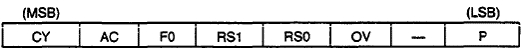 Além desses dois registradores, é importante citar a função do Program Status Word (PSW). Esse registrador, ilustrado na Figura abaixo, contém as flags de estado da CPU, pode ser endereçado bit a bit e está localizado no endereço D0H.