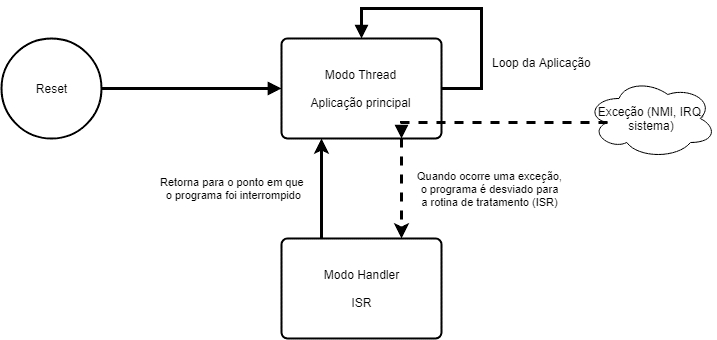 Existem dois modos de operação: Thread e Handler. O modo Thread é definido quando a operação do processador é iniciada (modo de Reset). O processador entra em modo Handler quando ocorre uma exceção (interrupção). Quando o contexto é restabelecido, o processador retorna para o estado Thread.