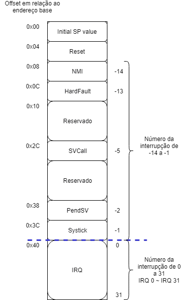 Toda exceção possui um número de identificação, um endereço na tabela de interrupções e uma prioridade de execução. Na tabela de interrupções, os primeiros 16 endereços possuem funções específicas, sendo o restante dependente do fabricante do microcontrolador. A primeira posição é destinada para indicar o endereço da região de stack. A segunda, para indicar o ponto de entrada da aplicação.