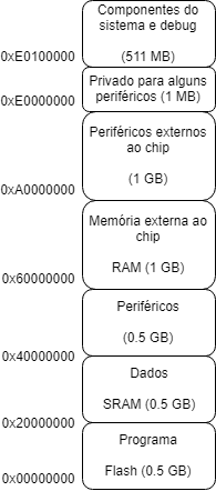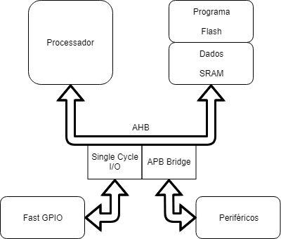 Os periféricos são conectados em outro barramento, chamado APB [1]. O APB é conectado ao barramento do sistema através de um módulo de interface (Bus Bridge). Com isso, o APB pode operar em frequências diferentes do barramento do sistema. Cabe ressaltar que os periféricos são mapeados em memória.